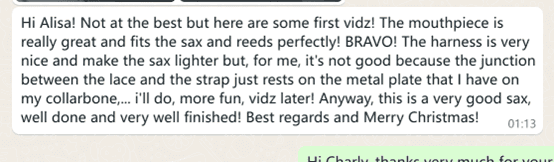 嗨,Alisa!虽然不是做的最好的,但这是一些我的视频!笛头非常棒,与萨克斯和哨片完美契合!太棒了!背带非常好,让萨克斯更轻,但对我来说,这并不好,因为系带和背带之间的连接处正好放在我锁骨上的金属板上...稍后再发视频!无论如何,这是一支非常好的萨克斯,做工精良,特别棒!致以最诚挚的问候,圣诞快乐!