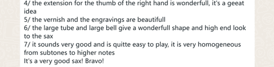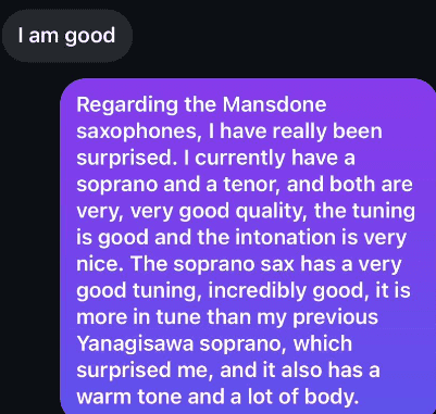 “关于迈迪诺 萨克斯管,我真的很惊讶。我现在有一支高音萨克斯管和一支次中音萨克斯管,这两支萨克斯管的质量都非常非常好,调音很好,音调也很好。高音萨克斯管的调音非常好,非常好,比我之前的雅马哈高音萨克斯管音准更好,这让我很惊讶,而且它的音色温暖,很有质感。”