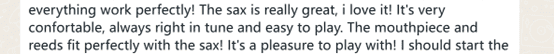 萨克斯真的很棒,我喜欢它!它非常舒适,音调始终准确,易于演奏。吹口和簧片与萨克斯完美契合!演奏起来很愉快!